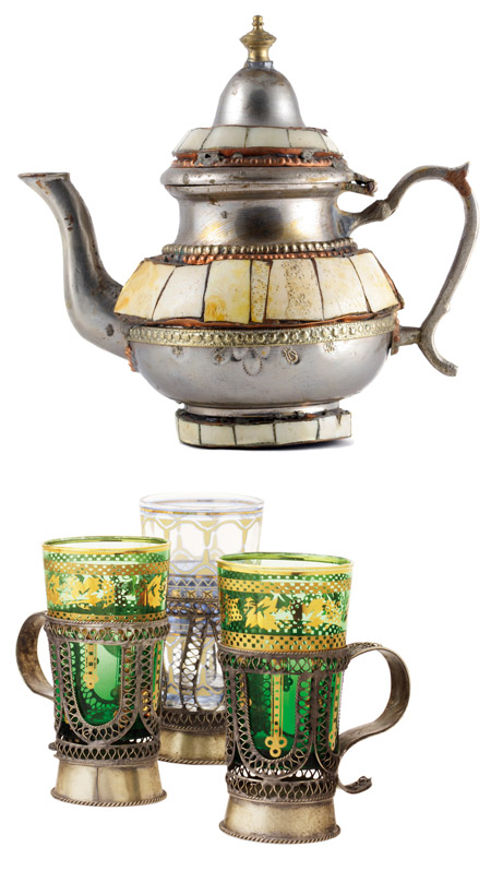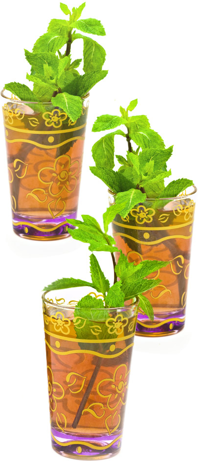 In Arabic society, women are traditionally in charge of family, home and hearth, but preparing and serving tea is man’s work. The preparation and service is considered a ceremonial act, much like tea drinking is in Japan. The preparation is very specific and the pouring of the tea is meaningful in that the height from which it is “streamed” into a waiting glass below is a measurement of respect for the person served. To illustrate, mint tea for the royal family of Morocco is served by specially appointed members of the court while standing on ladders. Affluent families and some shop keepers also employ a moul atai, a man whose duty it is to prepare and serve mint tea.